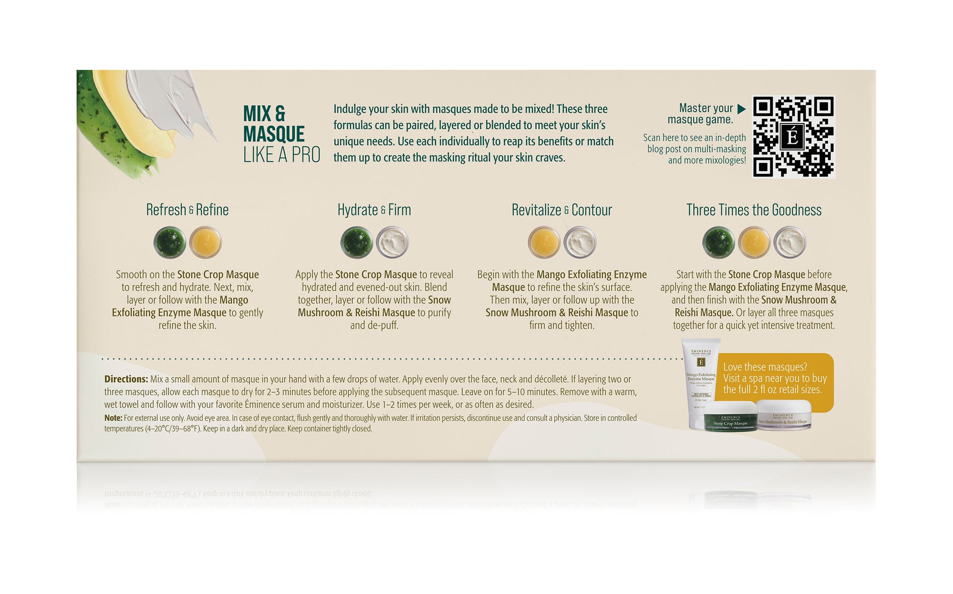 Unlock your skin’s full potential, one mask at a time. This fan-favorite gift set is back and reimagined with three fresh masks! Layer on the Stone Crop Masque, Mango Exfoliating Enzyme Masque and Snow Mushroom & Reishi Masque to reveal a restored, balanced and revitalized glow.