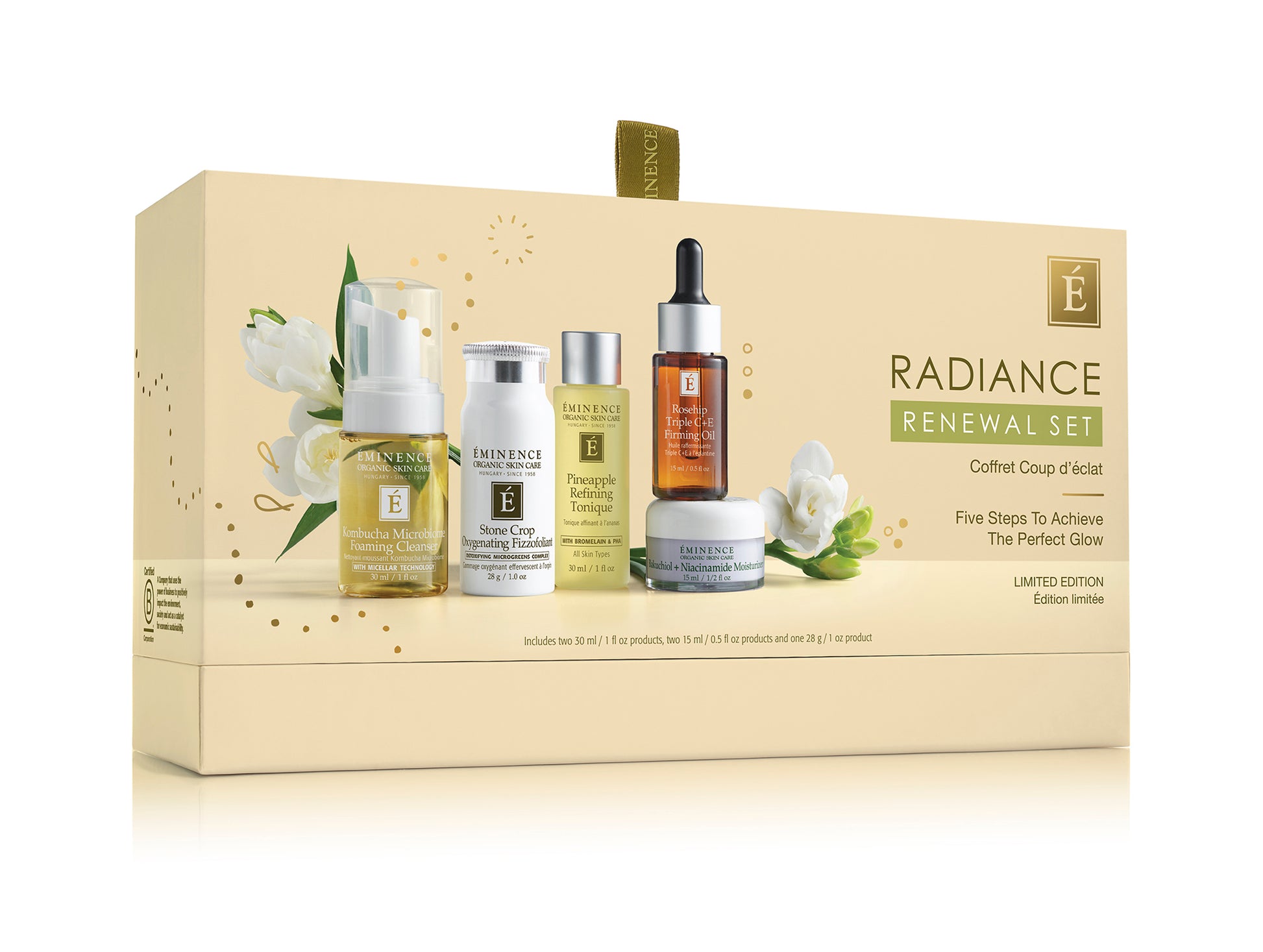 Our Limited Edition Radiance Renewal Gift Set is a curated collection of innovative and award-winning staples to transform your everyday skin care routine into an exquisite and revitalizing mini ritual. These five travel-size Eminence products are designed to reveal radiance and luminosity at home or on the go.